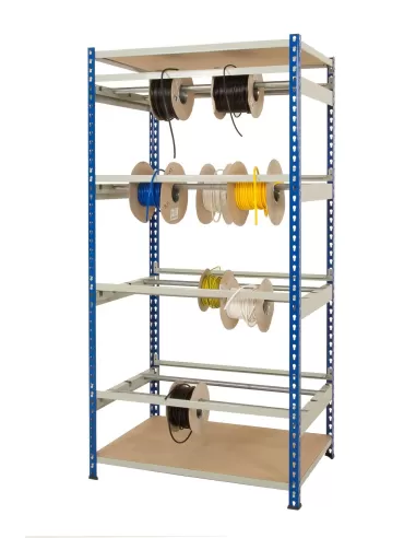 A new solution for organising and dispensing cable & items stored in reels. The simple side beam supports a 25mm diameter tube which can hold a variety of drums or reels. The beam is notched so that the tubes can be placed in 5 different positions. Each level is then fitted with a face beam to enable the material to be passed to the user and conveniently cut to length.